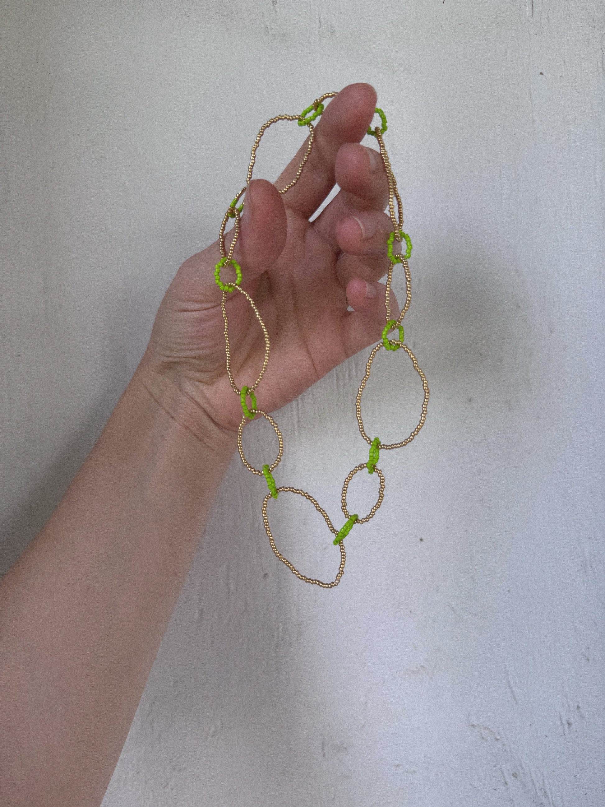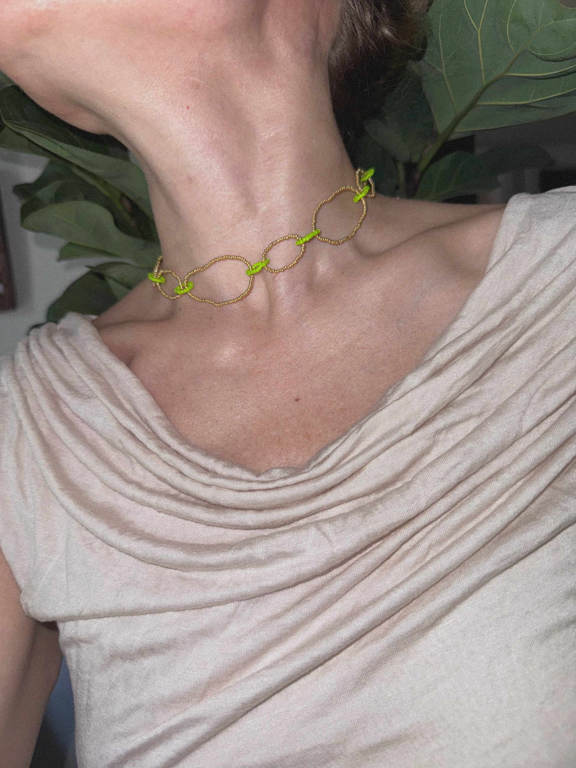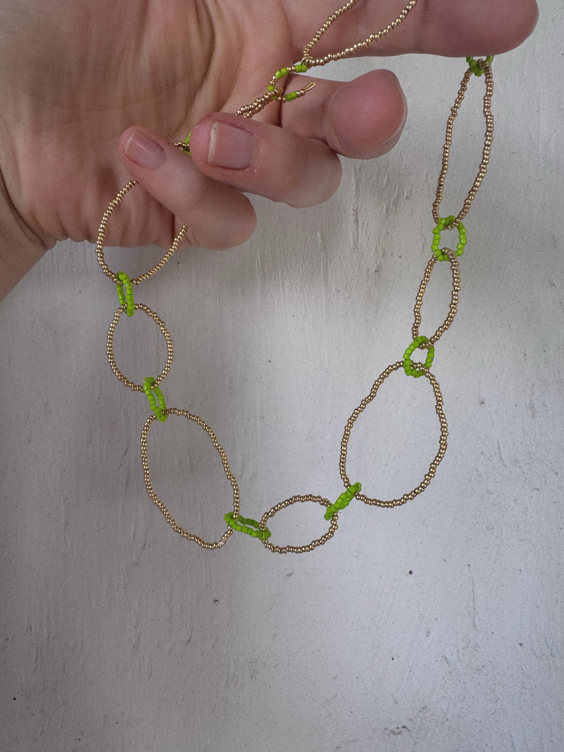 Hand beaded using intense green and gold toned Japanese MIYUKI seed beads. Light weight and elegant with a discreet beaded hook closure. Length is 15 inches. Custom Lengths available- Please DM me on Instagram.