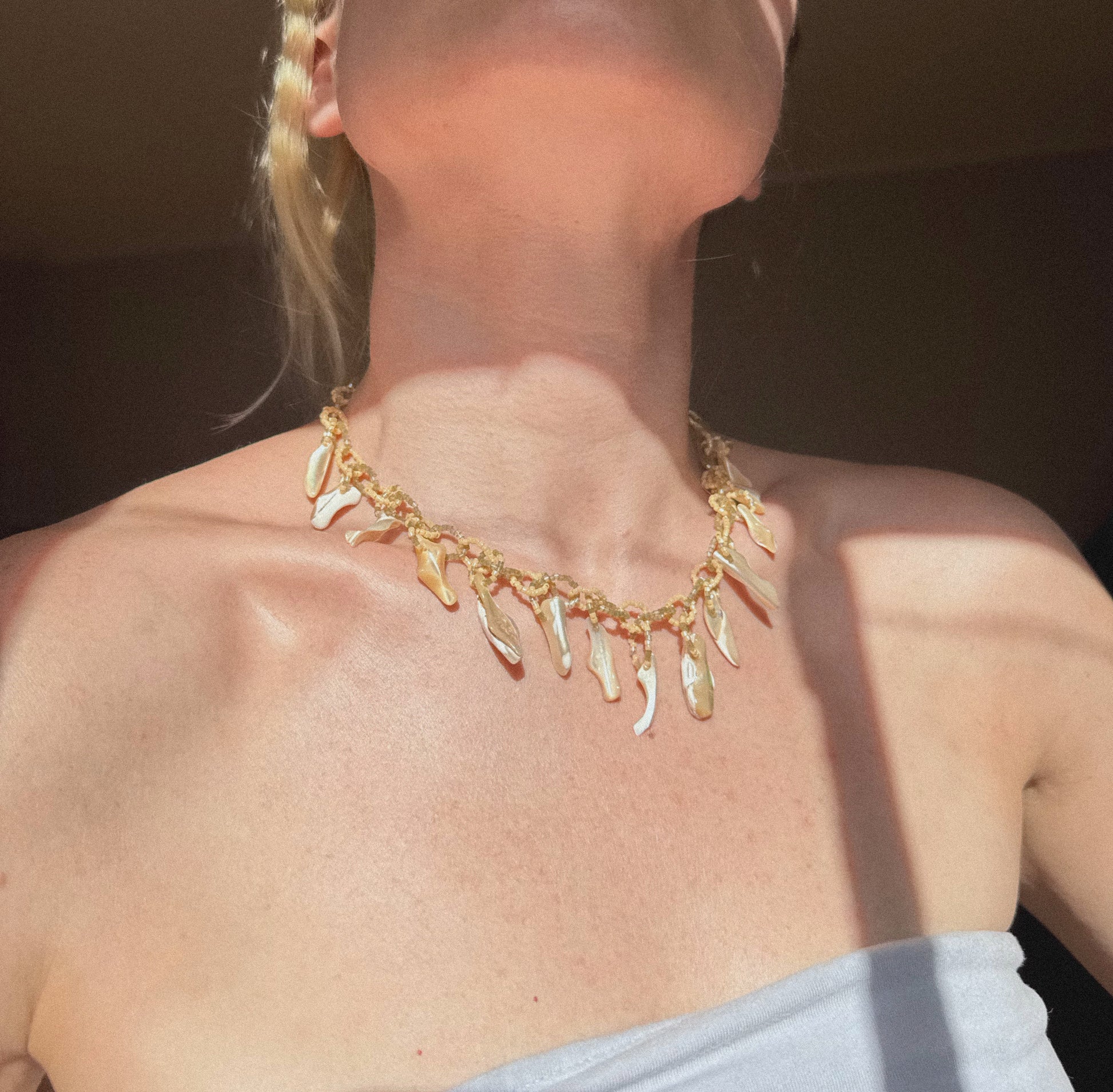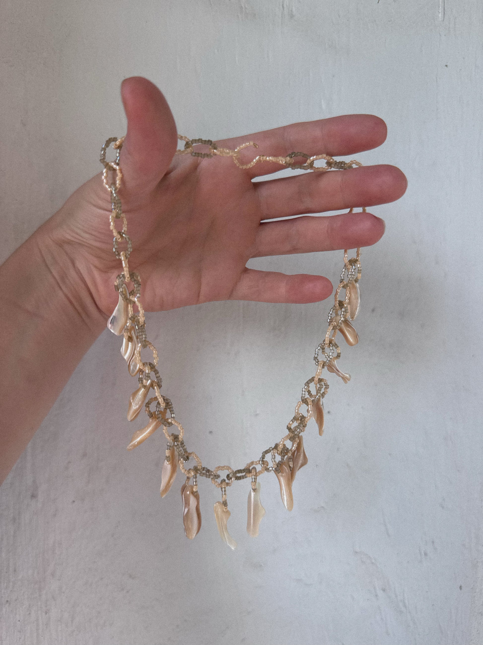 Signature hand beaded LOTTI chain link necklace with shell fragment tassels. Neutral/Earth tones. Elegant and whimsical. length is 16 inches. Custom Lengths available- DM me on instagram.