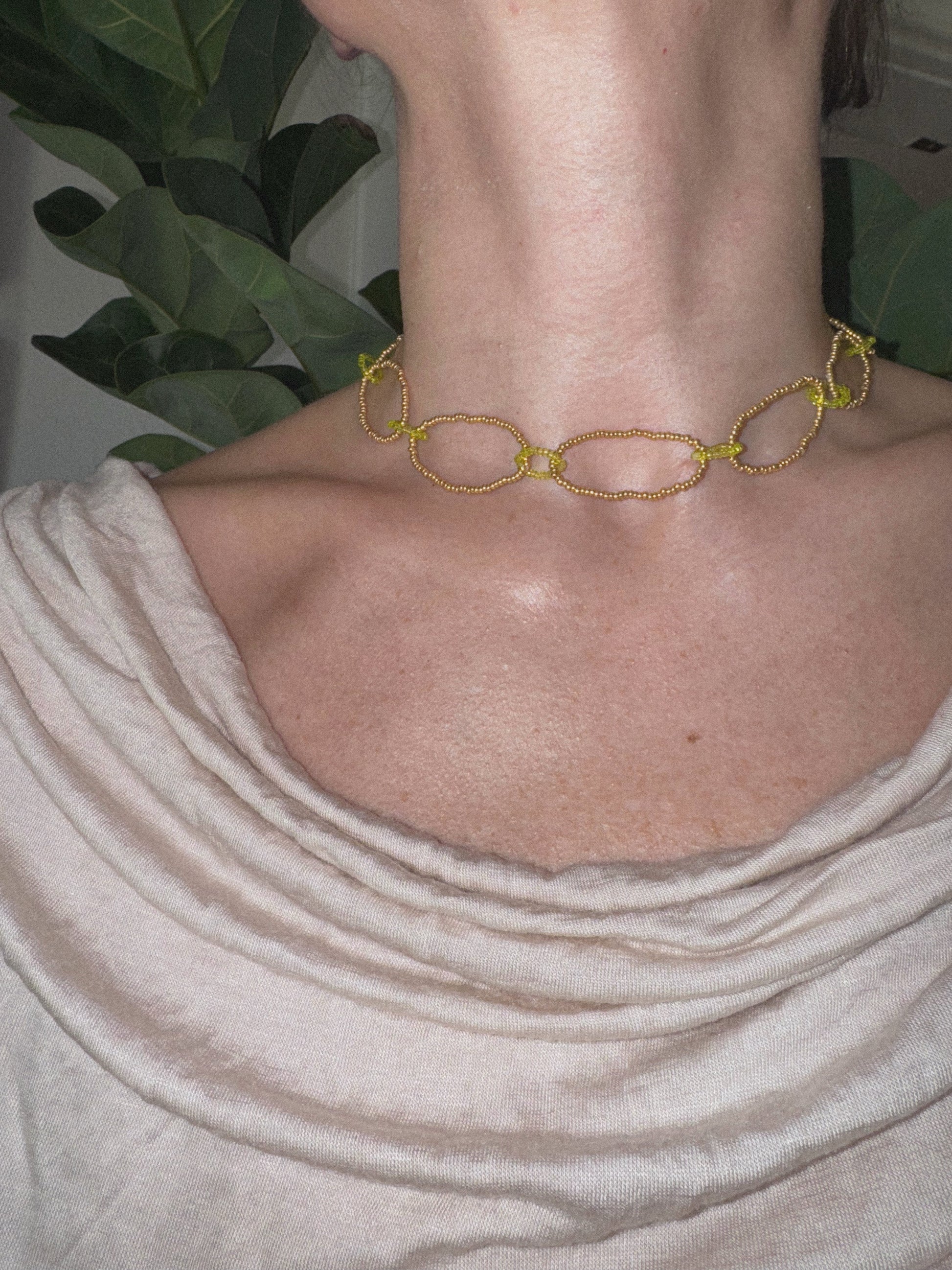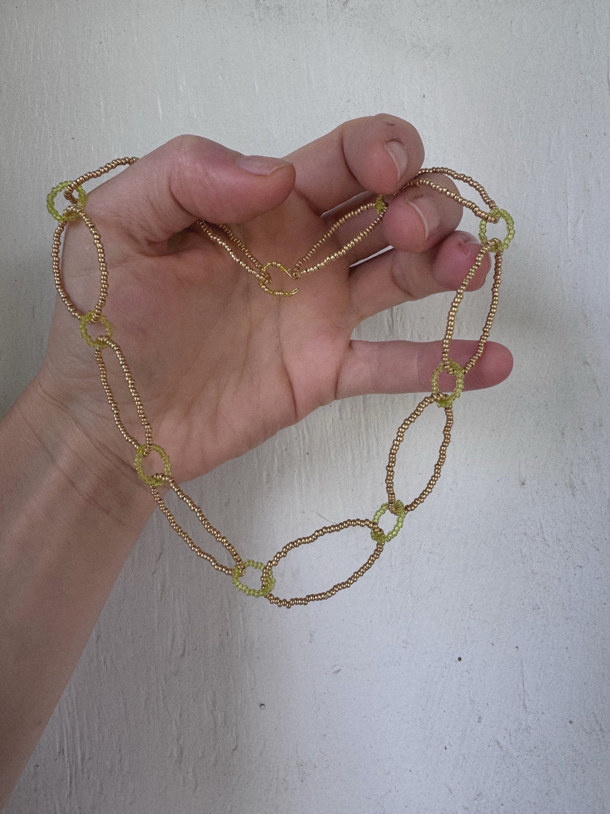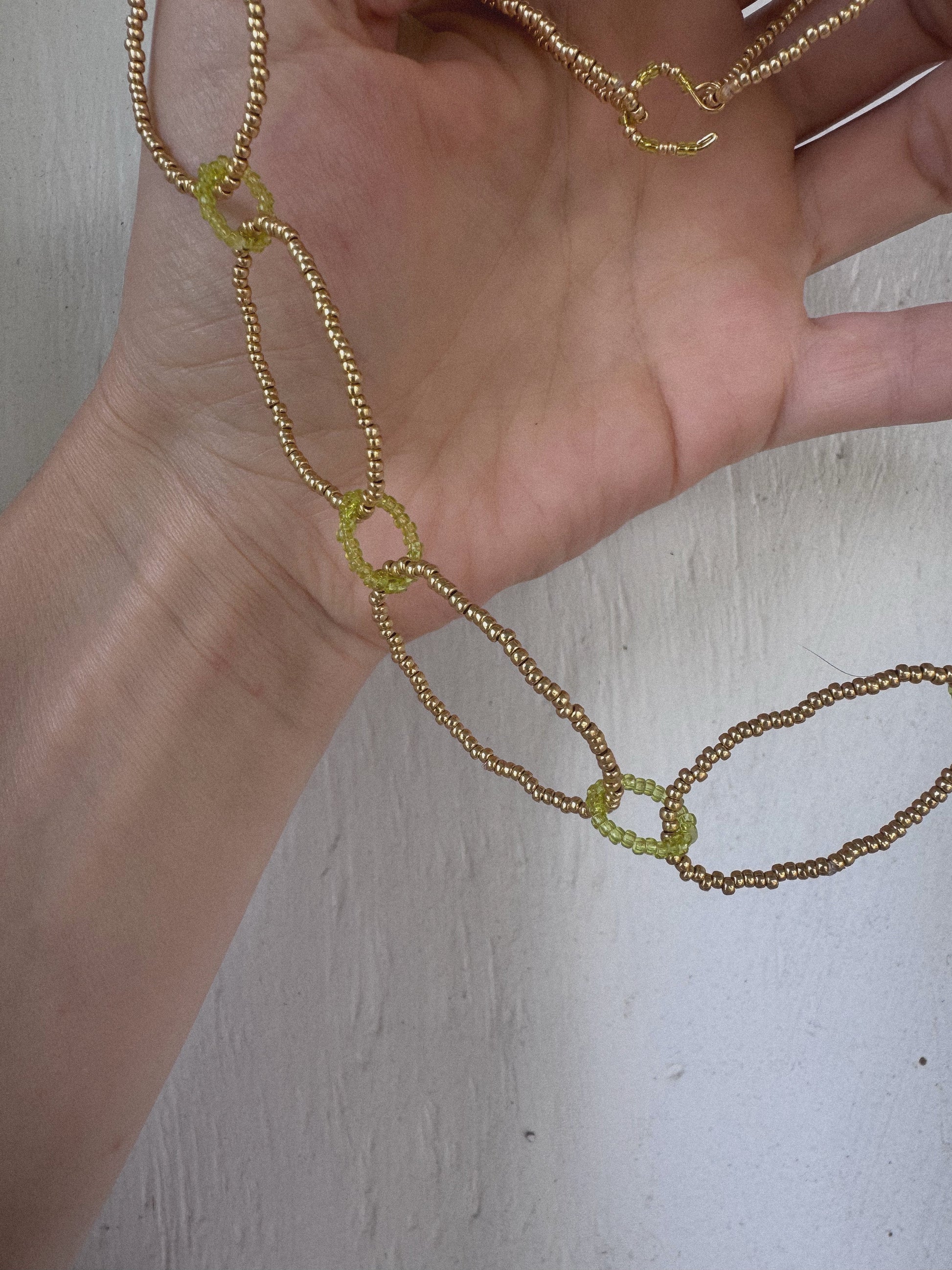 Hand beaded using translucent green/gold toned Japanese MIYUKI seed beads. Light weight and elegant with a Discreet beaded hook closure in back. length is 15 Inches. Custom lengths available- Please DM me on instagram.