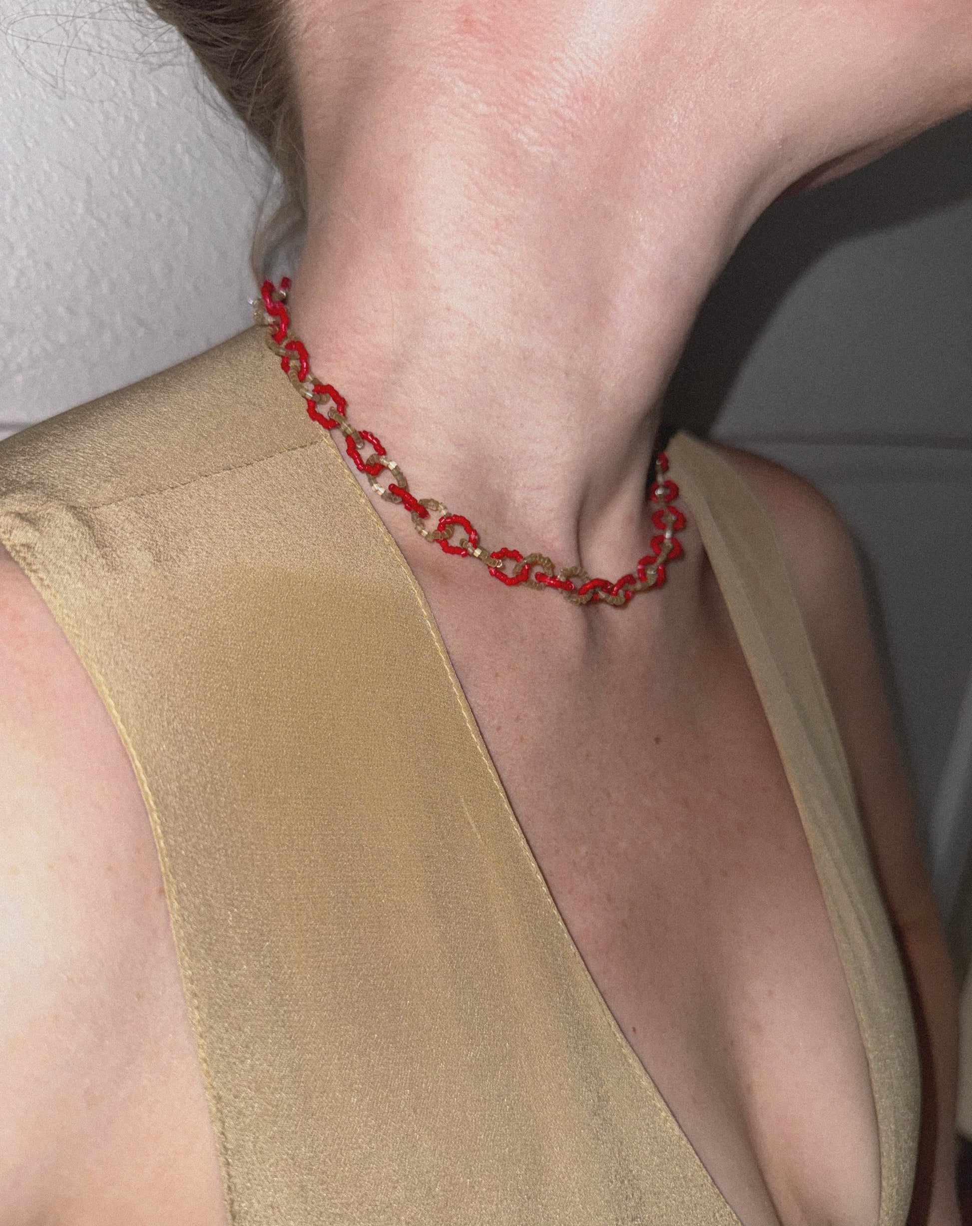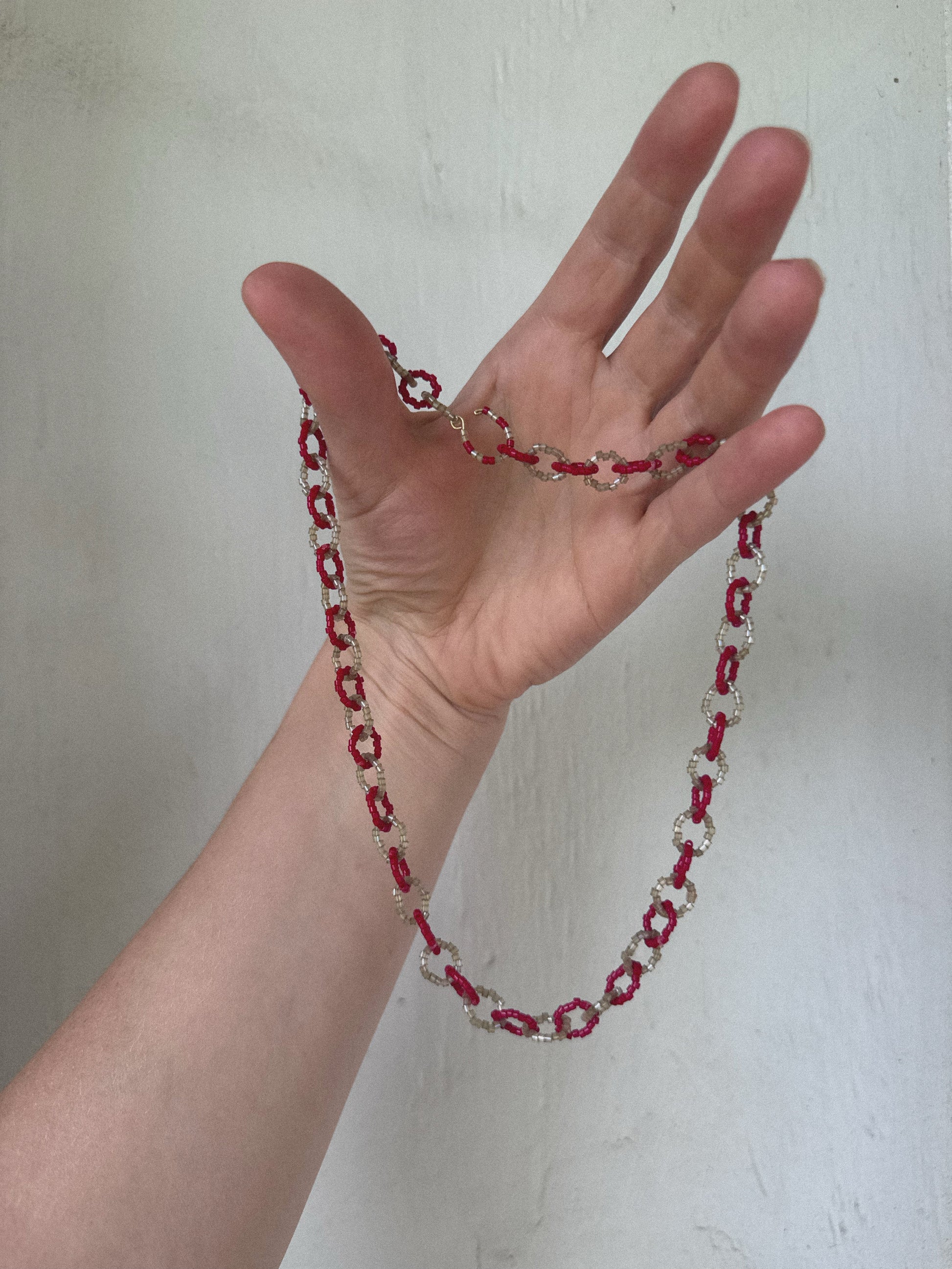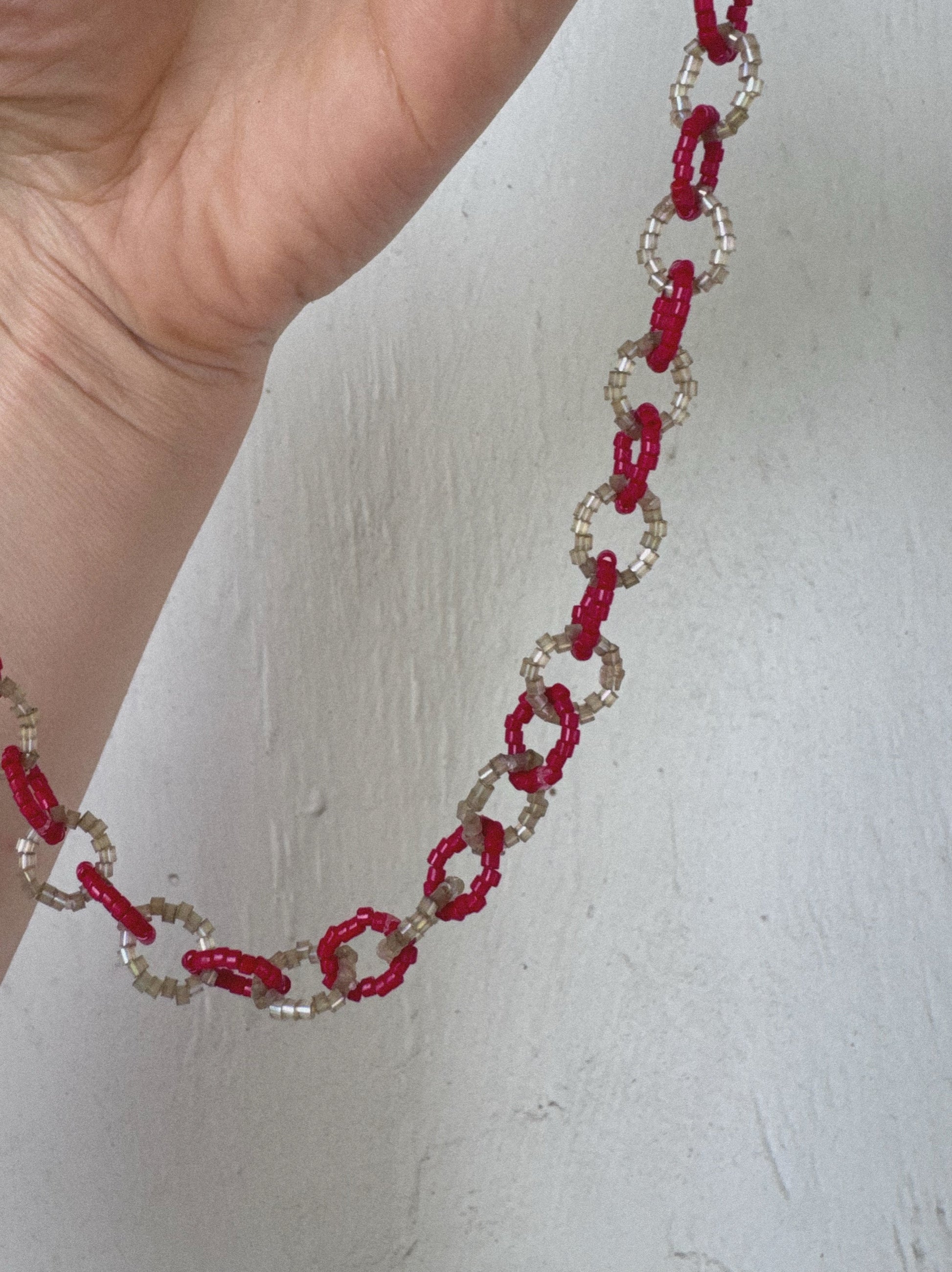 Signature LOTTI beaded chain link necklace. Hand beaded using Cranberry/Taupe toned Japanese MIYUKI seed beads. Delicate and lightweight yet durable. Length is 16 inches. Custom lengths available- please DM me on Instagram.